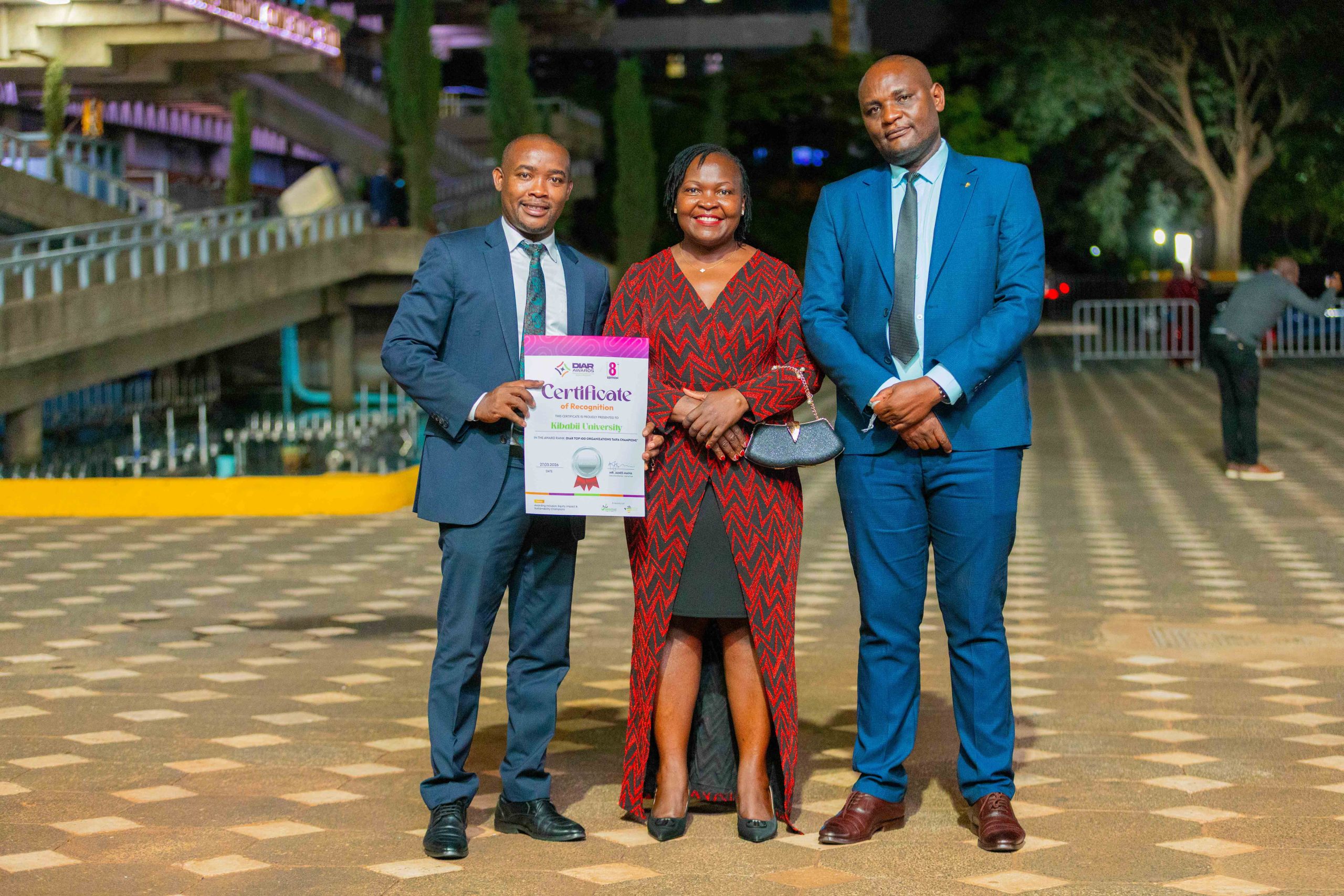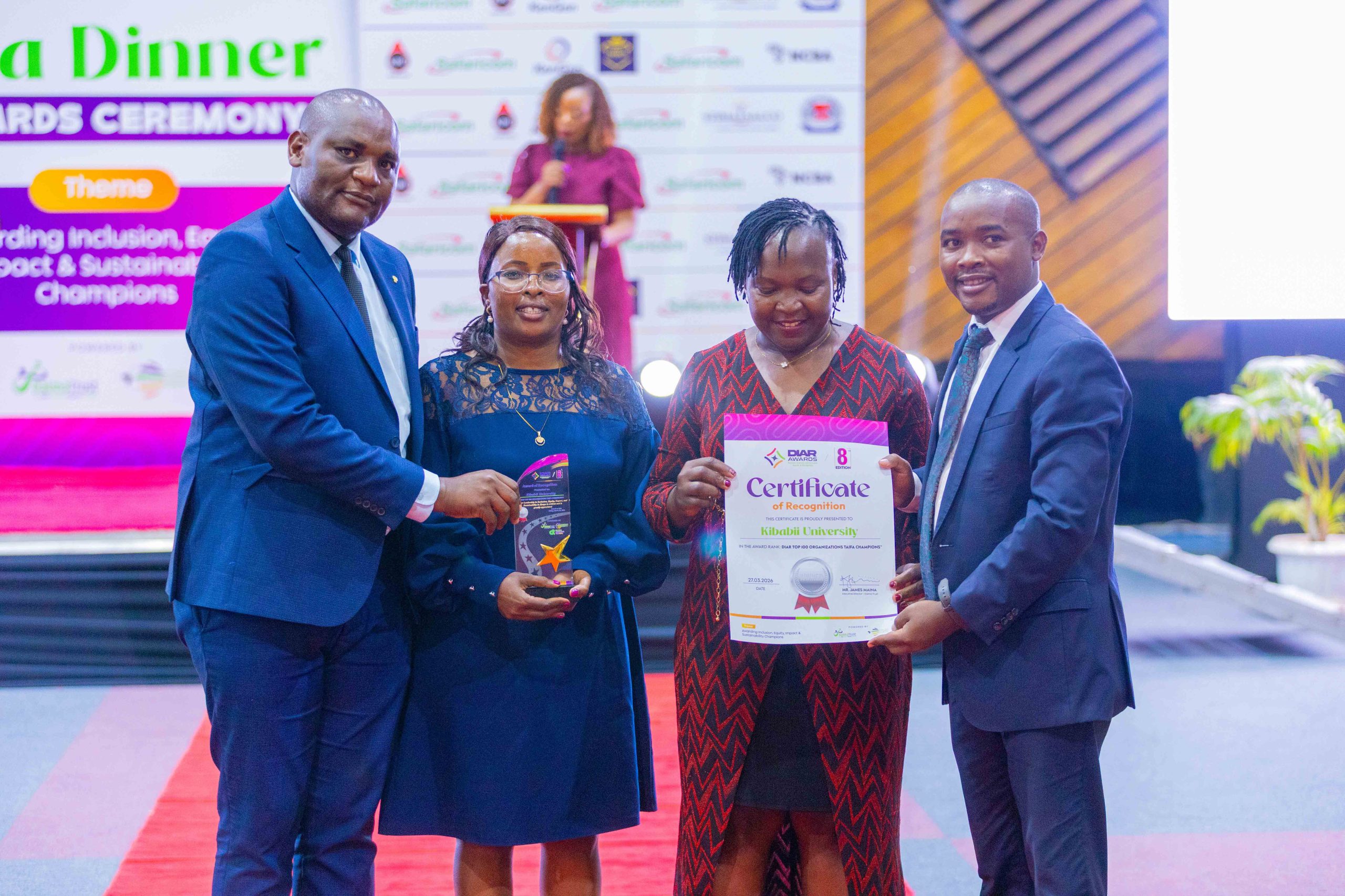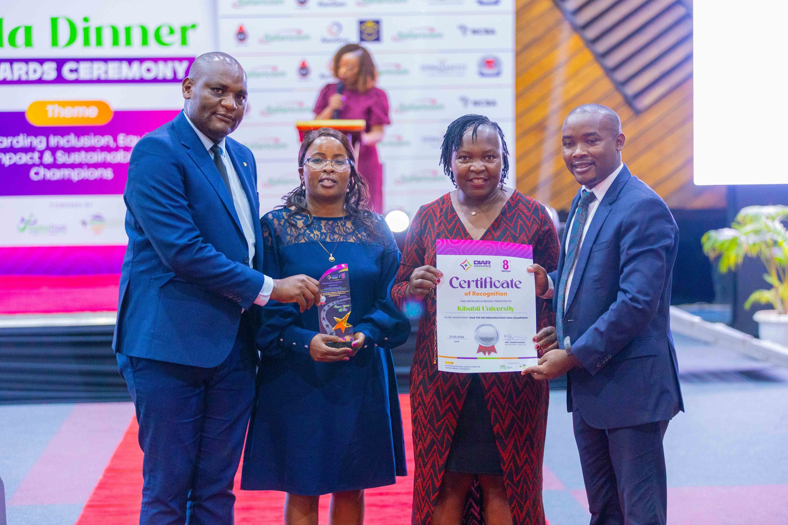 Kibabii University was recognized among Kenya’s leading institutions after winning an award at the 8th Diversity and Inclusion Awards & Recognition (DIAR) Gala Dinner held on Friday 27th March, 2026 at the Kenyatta International Convention Centre (KICC), Nairobi. The University was honored under the “Taifa Champions Category” in recognition of its outstanding commitment to inclusivity, equity, sustainability, and social impact. The Award was officially received by the Member of the University Council, Dr. Jeniffer Chepkemoi on behalf of the Chairman of Council and the University.