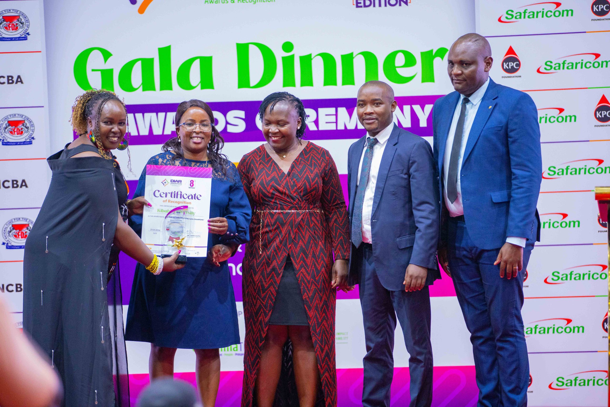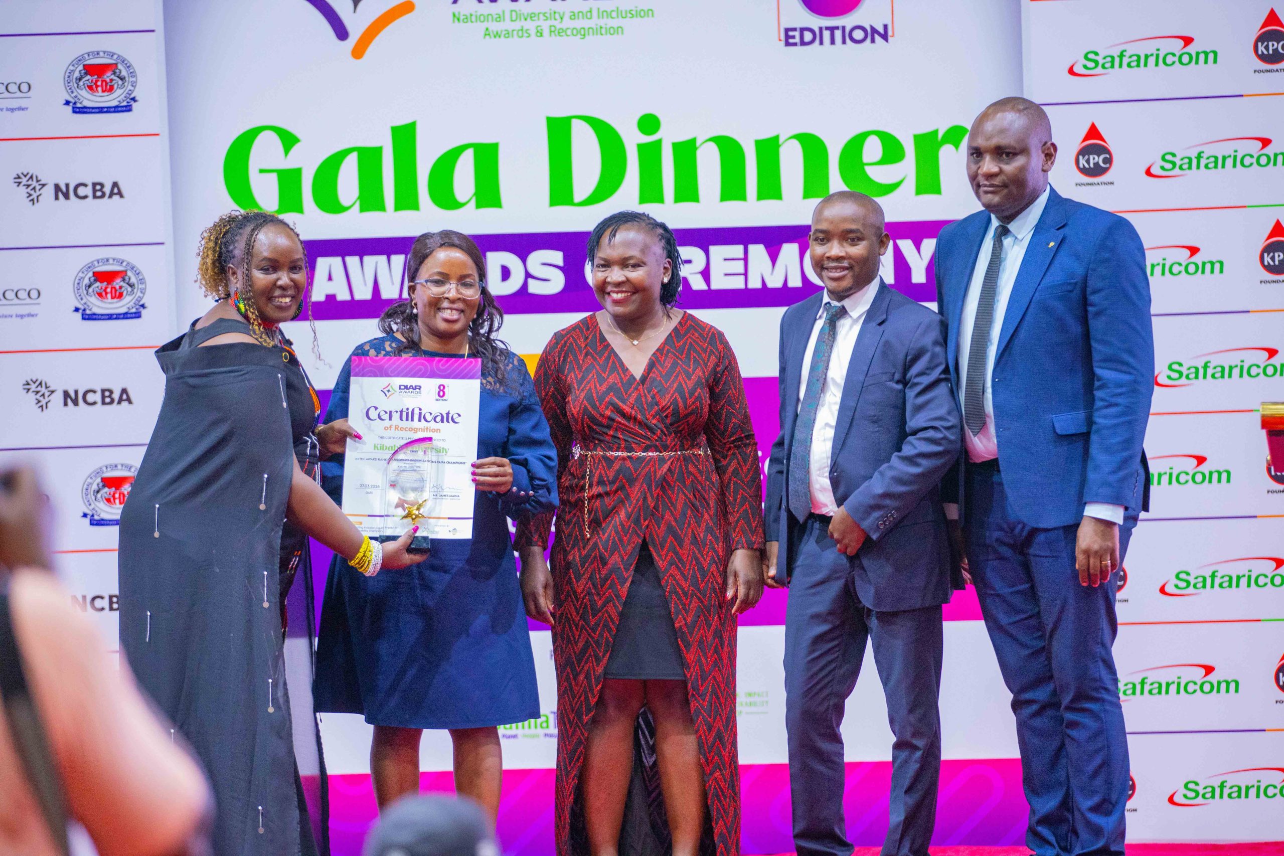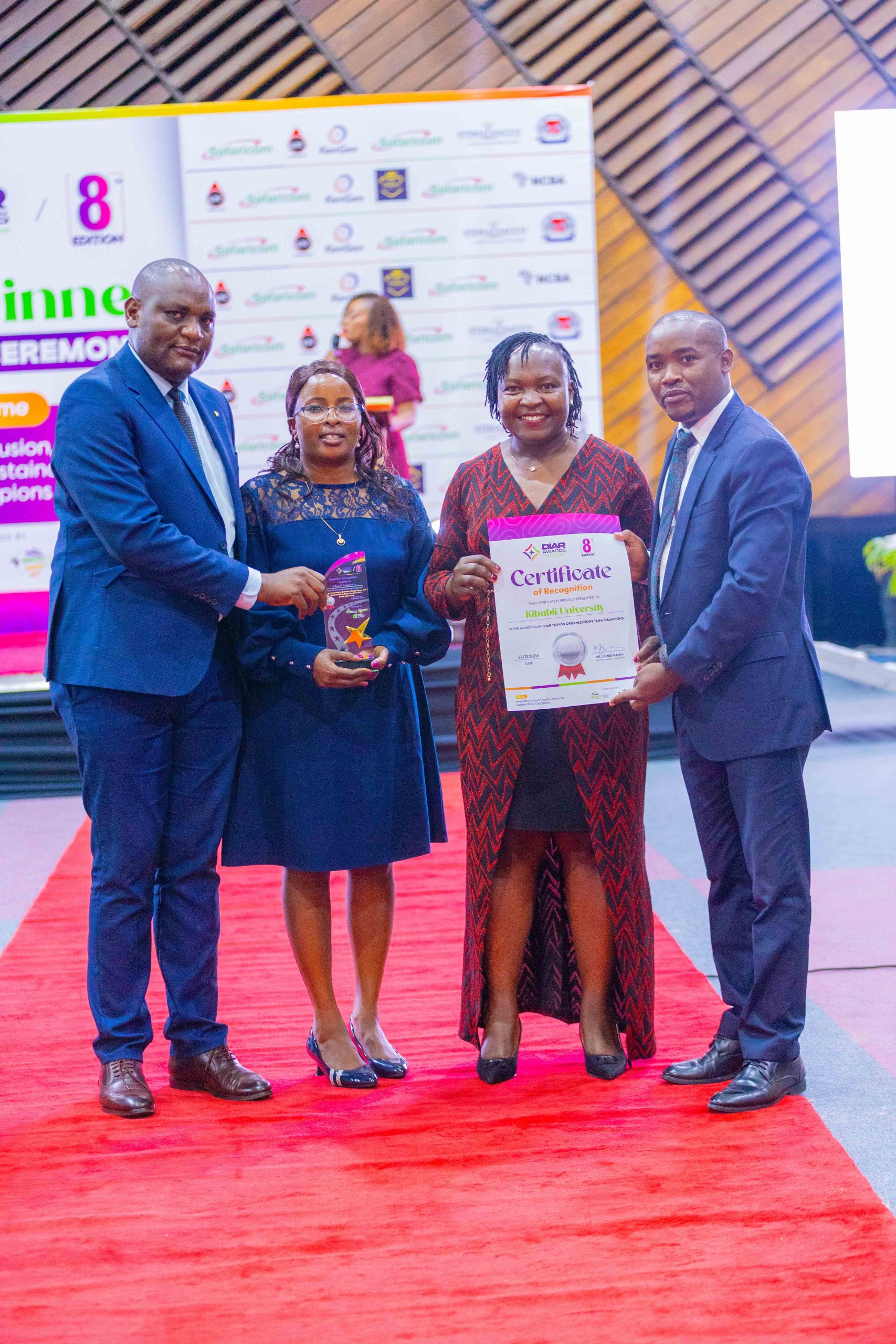 Kibabii University was recognized among Kenya’s leading institutions after winning an award at the 8th Diversity and Inclusion Awards & Recognition (DIAR) Gala Dinner held on Friday 27th March, 2026 at the Kenyatta International Convention Centre (KICC), Nairobi. The University was honored under the “Taifa Champions Category” in recognition of its outstanding commitment to inclusivity, equity, sustainability, and social impact. The Award was officially received by the Member of the University Council, Dr. Jeniffer Chepkemoi on behalf of the Chairman of Council and the University.